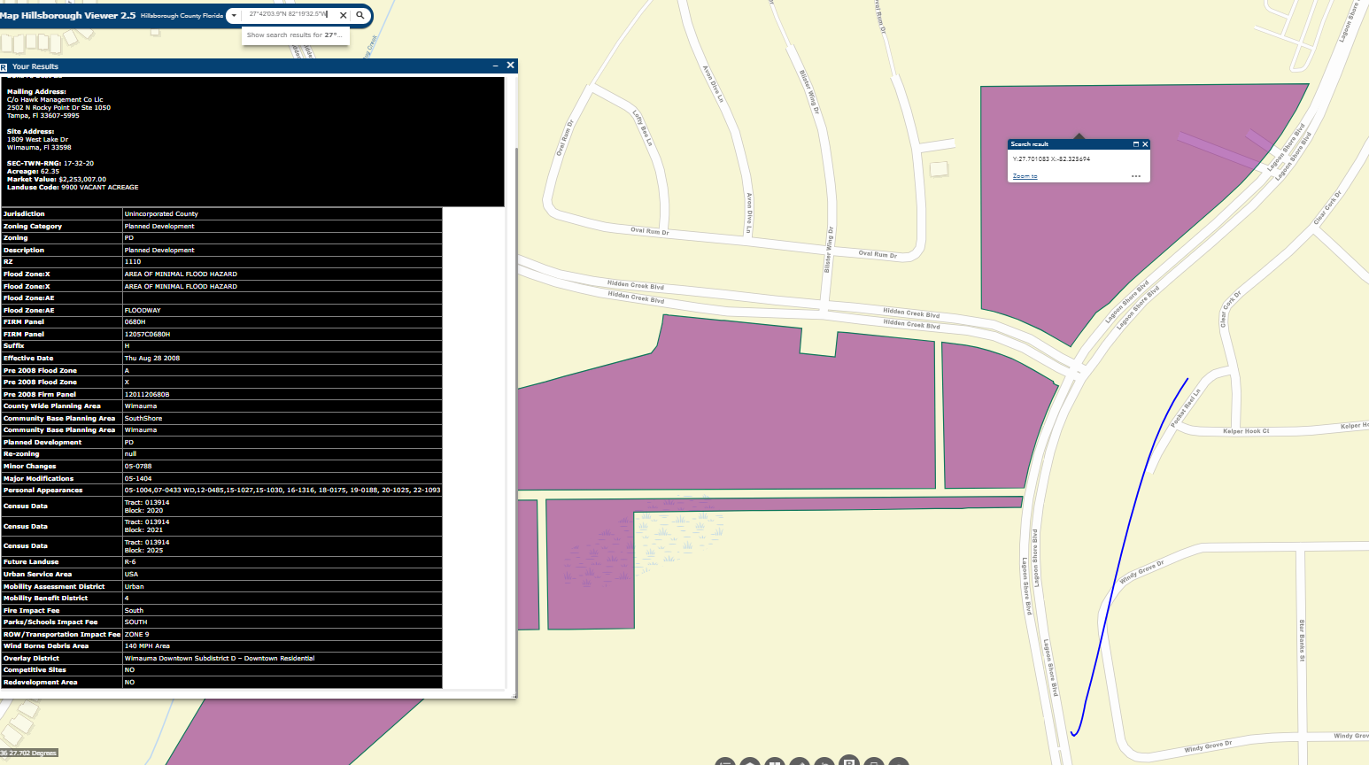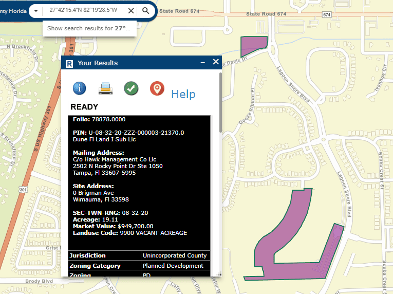 Folio: 78932.1496 PIN: U-08-32-20-A96-000000-A0000.0 Dune Fl Land I Sub Llc Mailing Address: C/o Hawk Management Co Llc 2502 N Rocky Point Dr Ste 1050 Tampa, Fl 33607-5995 Site Address: 0 Wimauma, Fl 33598 SEC-TWN-RNG: 08-32-20 Acreage: 2.44 Market Value: $1,830.00 Landuse Code: 0000 VACANT RESIDENT | Folio: 78878.0000 PIN: U-08-32-20-ZZZ-000003-21370.0 Dune Fl Land I Sub Llc Mailing Address: C/o Hawk Management Co Llc 2502 N Rocky Point Dr Ste 1050 Tampa, Fl 33607-5995 Site Address: 0 Brigman Ave Wimauma, Fl 33598 SEC-TWN-RNG: 08-32-20 Acreage: 19.11 Market Value: $949,700.00 Landuse Code: 9900 VACANT ACREAGE | Folio: 79543.0000 PIN: U-17-32-20-2XN-000000-00002.0 Dune Fb Debt Llc Mailing Address: C/o Hawk Management Co Llc 2502 N Rocky Point Dr Ste 1050 Tampa, Fl 33607-5995 Site Address: 1809 West Lake Dr Wimauma, Fl 33598 SEC-TWN-RNG: 17-32-20 Acreage: 62.35 (portion only) Market Value: $2,253,007.00 Landuse Code: 9900 VACANT ACREAGE | ||||||||||||||||||